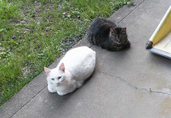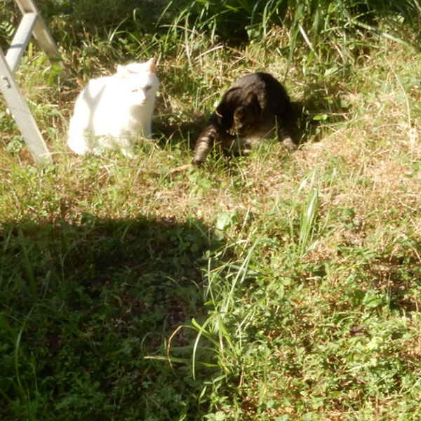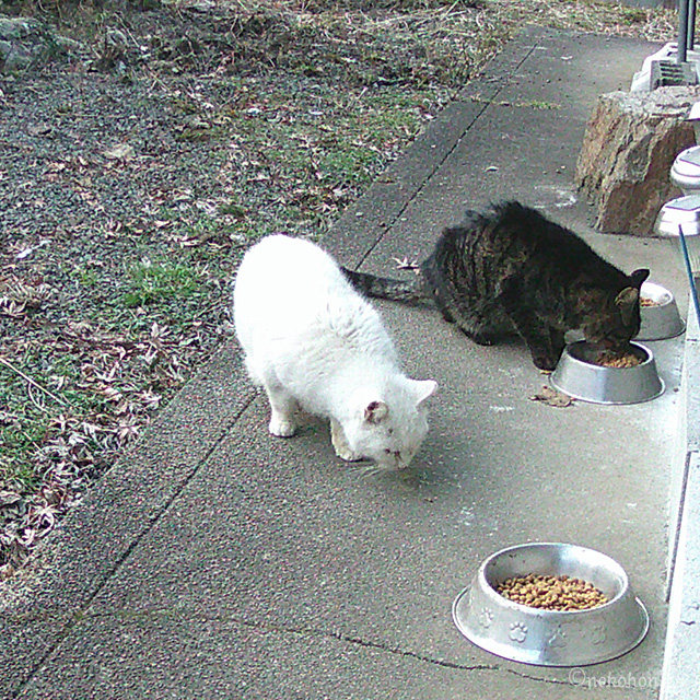 やがて、外猫仲間にチロリンが加わりました。2ニャンはあっという間に仲良しになり、その後は常に一緒に行動するようになりました。どちらかというと、チロリンがヤマちゃんのあとをいつも必死に追いかけてくっついている、という感じでした。