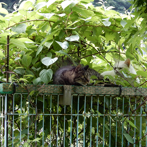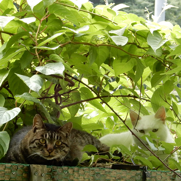 キャットフードをお腹いっぱい食べて、さらに猫の本能の命ずるままに好きにハンティング。冬は私の所有する廃屋にセットされたムートンのベッドで眠り、夏はまたたびの木陰で酔っ払う。このまたたびは私が猫たちのために庭に植えたものです。