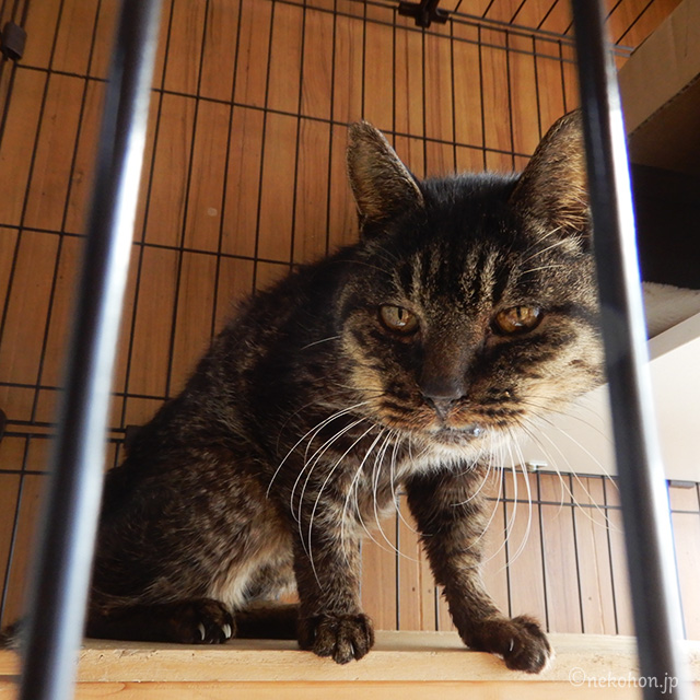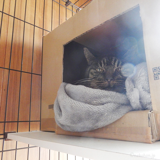 性格のキツイ猫でしたが、そこは賢い猫。自分がすでに高齢なこと、体もすっかり弱っていること、吹雪の中より家の中のこのケージにいる方が、今の自分にははるかに暖かく快適なことを理解してくれたようです。
