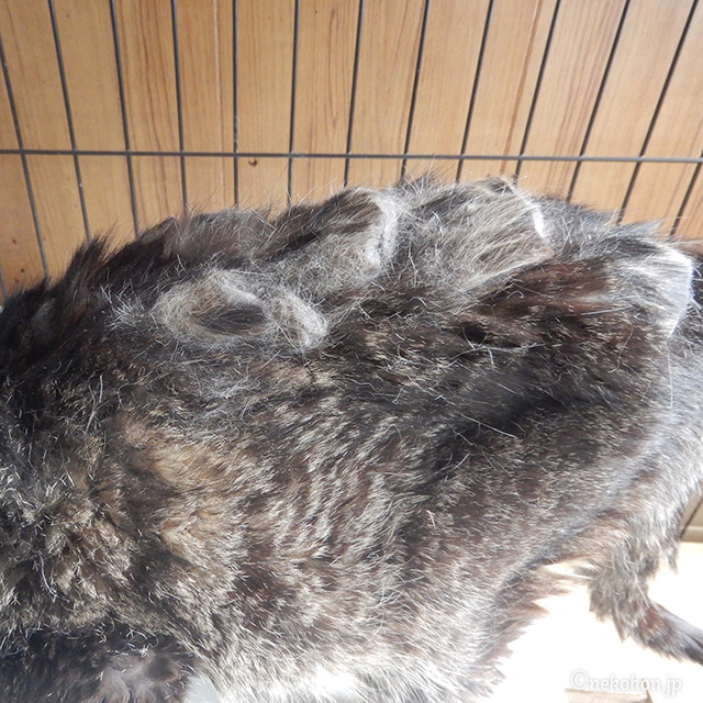 ケージ生活に少し慣れてきた頃、スキを見て、少しずつ毛玉を切っていきます。といっても、先っぽだけです。猫の皮膚は驚くほど伸びますから、下手に切ると皮膚まで切ってしまいかねません。それは絶対に避けたいので、こんな凸凹状態に。ごめん。