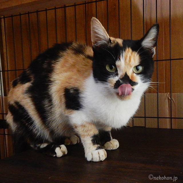 これぞ三毛猫って感じの色合いです。尻尾は長くて真っ直ぐ。
