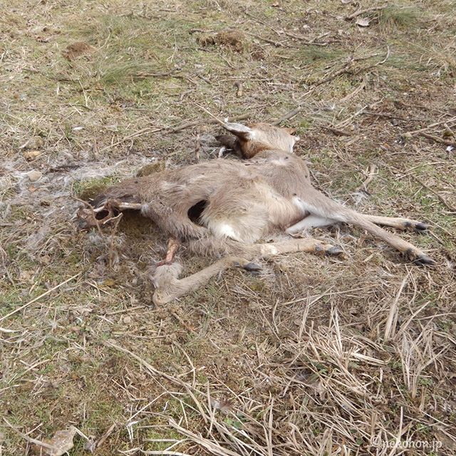 - 近くにシカさんの遺体があった。胸に穴が空き、臀部が大きく損傷していた。